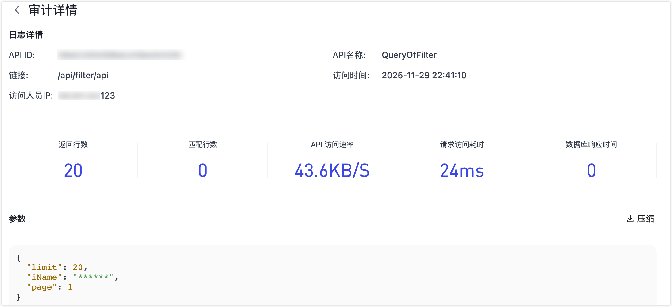 - 日志详情:包括请求的基本信息与指标,例如 API 的 ID、名称、请求方法与路径、请求者 IP、状态码、时间戳等。