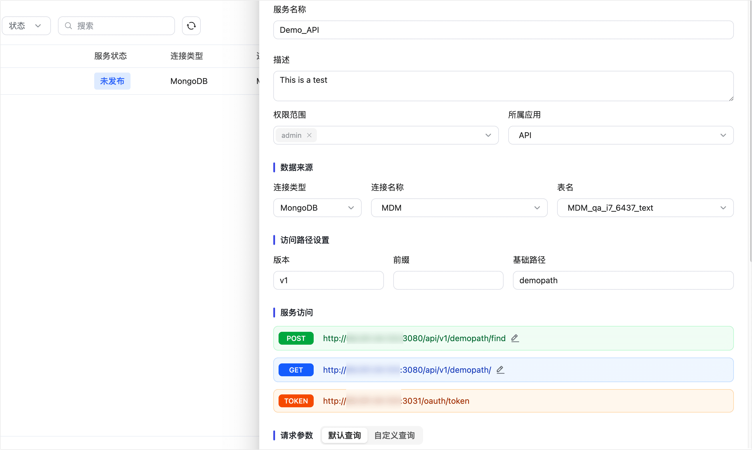 - 选择为默认查询时,系统会自动包含三个内置参数:page、limit 和 filter。客户端可通过这些参数动态控制分页和过滤;不支持自定义参数。